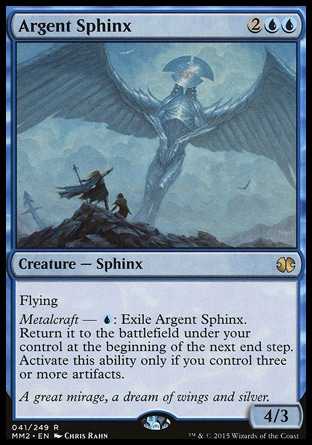 Card TextFlying Metalcraft — {U}: Exile Argent Sphinx. Return it to the battlefield under your control at the beginning of the next end step. Activate this ability only if you control three or more artifacts.