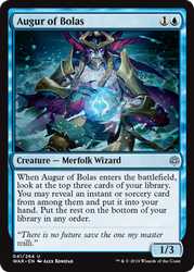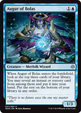 Card Text | When Augur of Bolas enters the battlefield, look at the top three cards of your library. You may reveal an instant or sorcery card from among them and put it into your hand. Put the rest on the bottom of your library in any order. |