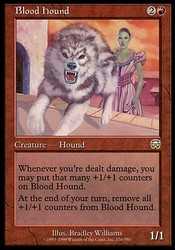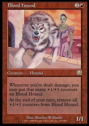 | Card Text | Whenever you re dealt damage, you may put that many +1/+1 counters on Blood Hound. At the beginning of your end step, remove all +1/+1 counters from Blood Hound. |
