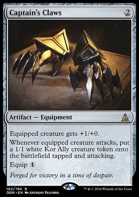 Whenever equipped creature attacks, put a 1/1 white Kor Ally creature token onto the battlefield tapped and attacking.