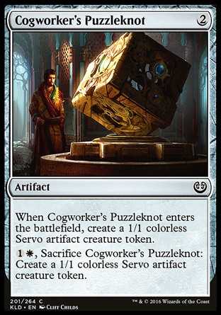 | Card Text | When Cogworker's Puzzleknot enters the battlefield, create a 1/1 colorless Servo artifact creature token. {1}{W}, Sacrifice Cogworker's Puzzleknot: Create a 1/1 colorless Servo artifact creature token. |