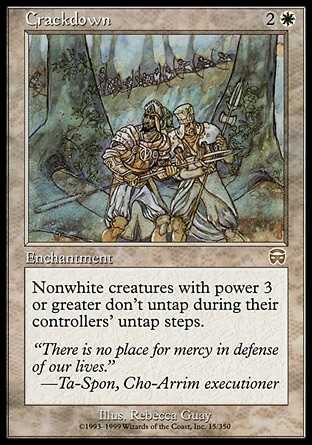 | Card Text | Nonwhite creatures with power 3 or greater don t untap during their controllers untap steps. |