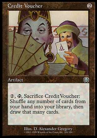 Card Text{2}, {T}, Sacrifice Credit Voucher: Shuffle any number of cards from your hand into your library, then draw that many cards.