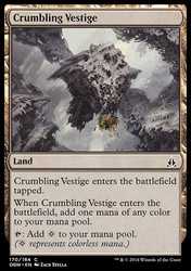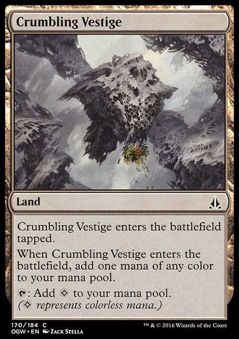 | Card Text | Crumbling Vestige enters the battlefield tapped. When Crumbling Vestige enters the battlefield, add one mana of any color to your mana pool. {T}: Add {C} to your mana pool. ({C} represents colorless mana.) |
