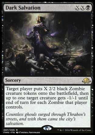 | Card Text | Target player puts X 2/2 black Zombie creature tokens onto the battlefield, then up to one target creature gets -1/-1 until end of turn for each Zombie that player controls. |