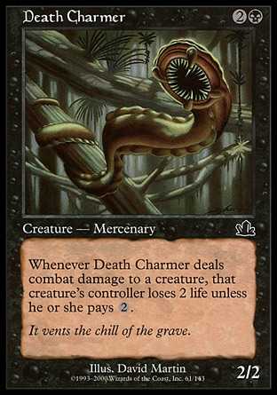 Card TextWhenever Death Charmer deals combat damage to a creature, that creature s controller loses 2 life unless he or she pays {2}.