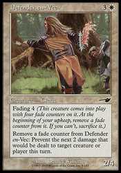 | Card Text | Fading 4 (This creature enters the battlefield with four fade counters on it. At the beginning of your upkeep, remove a fade counter from it. If you can t, sacrifice it.) Remove a fade counter from Defender en-Vec: Prevent the next 2 damage that would be dealt to target creature or player this turn. |