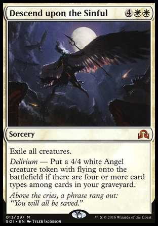 | Card Text | Exile all creatures. Delirium — Put a 4/4 white Angel creature token with flying onto the battlefield if there are four or more card types among cards in your graveyard. |