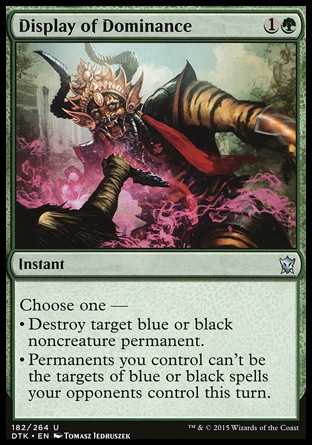 | Card Text | Choose one — • Destroy target blue or black noncreature permanent. • Permanents you control can t be the targets of blue or black spells your opponents control this turn. |
