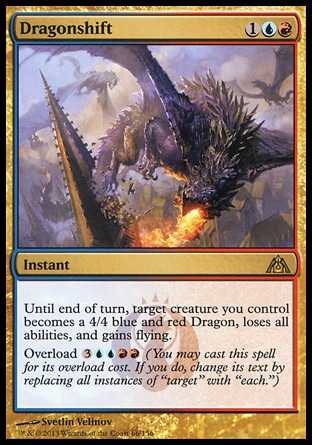 Card TextUntil end of turn, target creature you control becomes a blue and red Dragon with base power and toughness 4/4, loses all abilities, and gains flying. Overload {3}{U}{U}{R}{R} (You may cast this spell for its overload cost. If you do, change its text by replacing all instances of "target" with "each.")