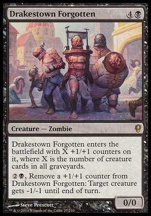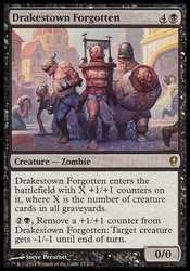 | Card Text | Drakestown Forgotten enters the battlefield with X +1/+1 counters on it, where X is the number of creature cards in all graveyards. {2}{B}, Remove a +1/+1 counter from Drakestown Forgotten: Target creature gets -1/-1 until end of turn. |