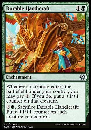 | Card Text | Whenever a creature enters the battlefield under your control, you may pay {1}. If you do, put a +1/+1 counter on that creature. {5}{G}, Sacrifice Durable Handicraft: Put a +1/+1 counter on each creature you control. |