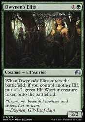 Card TextWhen Dwynen s Elite enters the battlefield, if you control another Elf, put a 1/1 green Elf Warrior creature token onto the battlefield.