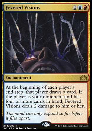Card TextAt the beginning of each player's end step, that player draws a card. If the player is your opponent and has four or more cards in hand, Fevered Visions deals 2 damage to him or her.