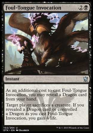 Card TextAs an additional cost to cast Foul-Tongue Invocation, you may reveal a Dragon card from your hand. Target player sacrifices a creature. If you revealed a Dragon card or controlled a Dragon as you cast Foul-Tongue Invocation, you gain 4 life.