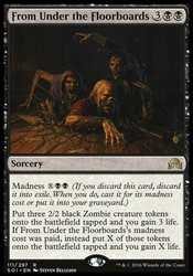 | Card Text | Madness {X}{B}{B} (If you discard this card, discard it into exile. When you do, cast it for its madness cost or put it into your graveyard.) Put three 2/2 black Zombie creature tokens onto the battlefield tapped and you gain 3 life. If From Under the Floorboards's madness cost was paid, instead put X of those tokens onto the battlefield tapped and you gain X life. |