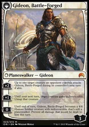 | Card Text | +2: Up to one target creature an opponent controls attacks Gideon, Battle-Forged during its controller s next turn if able. +1: Until your next turn, target creature gains indestructible. Untap that creature. 0: Until end of turn, Gideon, Battle-Forged becomes a 4/4 Human Soldier creature with indestructible that s still a planeswalker. Prevent all damage that would be dealt to him this turn. |