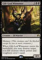 Card TextMenace (This creature can t be blocked except by two or more creatures.) When Gilt-Leaf Winnower enters the battlefield, you may destroy target non-Elf creature whose power and toughness aren t equal.