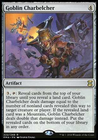 | Card Text | {3}, {T}: Reveal cards from the top of your library until you reveal a land card. Goblin Charbelcher deals damage equal to the number of nonland cards revealed this way to target creature or player. If the revealed land card was a Mountain, Goblin Charbelcher deals double that damage instead. Put the revealed cards on the bottom of your library in any order. |