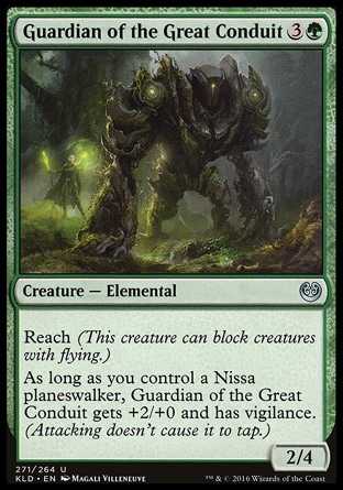 | Card Text | Reach (This creature can block creatures with flying.) As long as you control a Nissa planeswalker, Guardian of the Great Conduit gets +2/+0 and has vigilance. (Attacking doesn't cause it to tap.) |