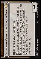 | Card Text | Trample, haste Whenever Hanweir, the Writhing Township attacks, put two 3/2 colorless Eldrazi Horror creature tokens onto the battlefield tapped and attacking. |