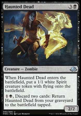 | Card Text | When Haunted Dead enters the battlefield, put a 1/1 white Spirit creature token with flying onto the battlefield. {1}{B}, Discard two cards: Return Haunted Dead from your graveyard to the battlefield tapped. |