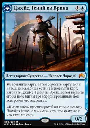 | Card Text | {T}: Draw a card, then discard a card. If there are five or more cards in your graveyard, exile Jace, Vryn s Prodigy, then return him to the battlefield transformed under his owner s control. |