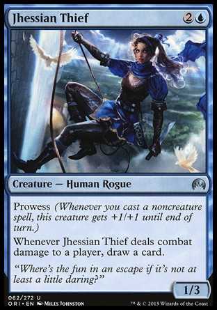 | Card Text | Prowess (Whenever you cast a noncreature spell, this creature gets +1/+1 until end of turn.) Whenever Jhessian Thief deals combat damage to a player, draw a card. |