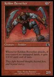 | Card Text | Whenever Keldon Berserker attacks, if you control no untapped lands, it gets +3/+0 until end of turn. |