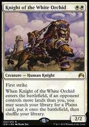 | Card Text | First strike When Knight of the White Orchid enters the battlefield, if an opponent controls more lands than you, you may search your library for a Plains card, put it onto the battlefield, then shuffle your library. |
