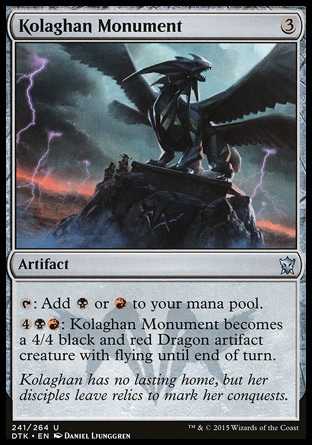 | Card Text | {T}: Add {B} or {R} to your mana pool. {4}{B}{R}: Kolaghan Monument becomes a 4/4 black and red Dragon artifact creature with flying until end of turn. |