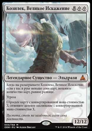 | Card Text | When you cast Kozilek, the Great Distortion, if you have fewer than seven cards in hand, draw cards equal to the difference. Menace Discard a card with converted mana cost X: Counter target spell with converted mana cost X. |