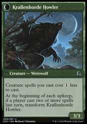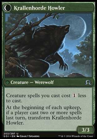 | Card Text | Creature spells you cast cost {1} less to cast. At the beginning of each upkeep, if a player cast two or more spells last turn, transform Krallenhorde Howler. |