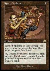 | Card Text | At the beginning of your upkeep, you may exile the top card of your library face down. {5}, Discard your hand, Sacrifice Kyren Archive: Put all cards exiled with Kyren Archive into their owner s hand. |