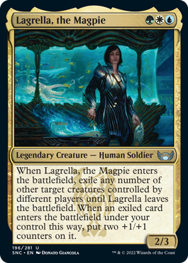 | Card Text | When Lagrella, the Magpie enters the battlefield, exile any number of other target creatures controlled by different players until Lagrella leaves the battlefield. When an exiled card enters the battlefield under your control this way, put two +1/+1 counters on it. |