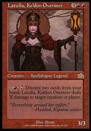 | Card Text | {X}{R}, {T}, Discard two cards: Latulla, Keldon Overseer deals X damage to target creature or player. |