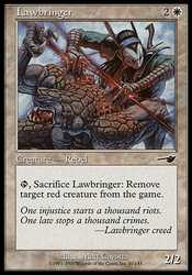 | Card Text | {T}, Sacrifice Lawbringer: Exile target red creature. |