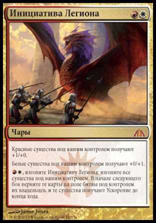 | Card Text | Red creatures you control get +1/+0. White creatures you control get +0/+1. {R}{W}, Exile Legion s Initiative: Exile all creatures you control. At the beginning of the next combat, return those cards to the battlefield under their owner s control and those creatures gain haste until end of turn. |