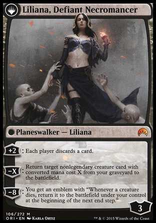 | Card Text | +2: Each player discards a card. −X: Return target nonlegendary creature card with converted mana cost X from your graveyard to the battlefield. −8: You get an emblem with "Whenever a creature dies, return it to the battlefield under your control at the beginning of the next end step." |