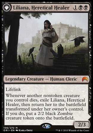 Card TextLifelink Whenever another nontoken creature you control dies, exile Liliana, Heretical Healer, then return her to the battlefield transformed under her owner s control. If you do, put a 2/2 black Zombie creature token onto the battlefield.