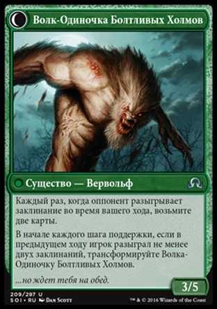 | Card Text | Whenever an opponent casts a spell during your turn, draw two cards. At the beginning of each upkeep, if a player cast two or more spells last turn, transform Lone Wolf of the Natterknolls. |
