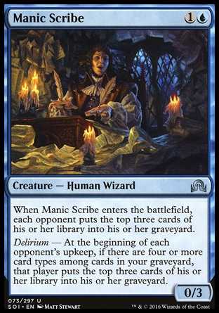 | Card Text | When Manic Scribe enters the battlefield, each opponent puts the top three cards of his or her library into his or her graveyard. Delirium — At the beginning of each opponent's upkeep, if there are four or more card types among cards in your graveyard, that player puts the top three cards of his or her library into his or her graveyard. |