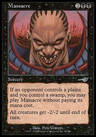 | Card Text | If an opponent controls a Plains and you control a Swamp, you may cast Massacre without paying its mana cost. All creatures get -2/-2 until end of turn. |