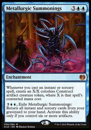 | Card Text | Whenever you cast an instant or sorcery spell, create an X/X colorless Construct artifact creature token, where X is that spell's converted mana cost. {3}{U}{U}, Exile Metallurgic Summonings: Return all instant and sorcery cards from your graveyard to your hand. Activate this ability only if you control six or more artifacts. |