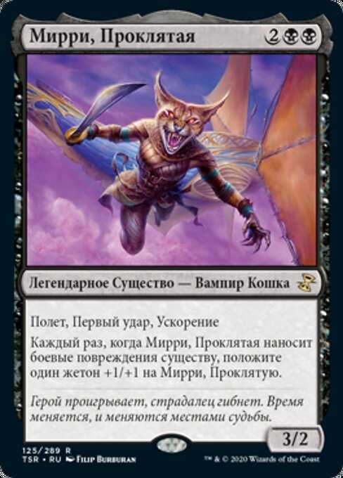 | Card Text | Flying, first strike, haste Whenever Mirri the Cursed deals combat damage to a creature, put a +1/+1 counter on Mirri the Cursed. |