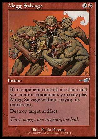 Card TextIf an opponent controls an Island and you control a Mountain, you may cast Mogg Salvage without paying its mana cost. Destroy target artifact.