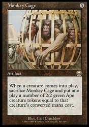 Card TextWhen a creature enters the battlefield, sacrifice Monkey Cage and put X 2/2 green Ape creature tokens onto the battlefield, where X is that creature s converted mana cost.