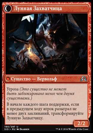 | Card Text | Menace (This creature can't be blocked except by two or more creatures.) At the beginning of each upkeep, if a player cast two or more spells last turn, transform Moonrise Intruder. |