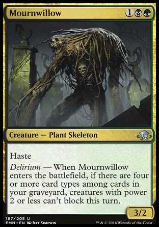 | Card Text | Haste Delirium — When Mournwillow enters the battlefield, if there are four or more card types among cards in your graveyard, creatures with power 2 or less can't block this turn. |