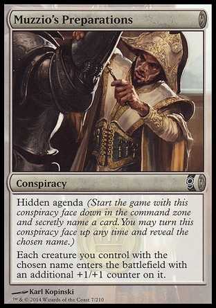 | Card Text | Hidden agenda (Start the game with this conspiracy face down in the command zone and secretly name a card. You may turn this conspiracy face up any time and reveal the chosen name.) Each creature you control with the chosen name enters the battlefield with an additional +1/+1 counter on it. |